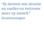 Verschillende accenten zijn mogelijk: - Vakmanschap versterken en profileren - Persoonlijke effectiviteit - Loopbaanontwikkeling en (her)-oriëntatie - Reïntegratie en burn-out preventie |